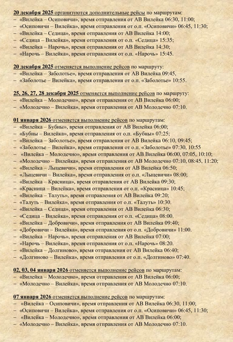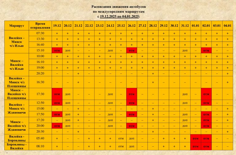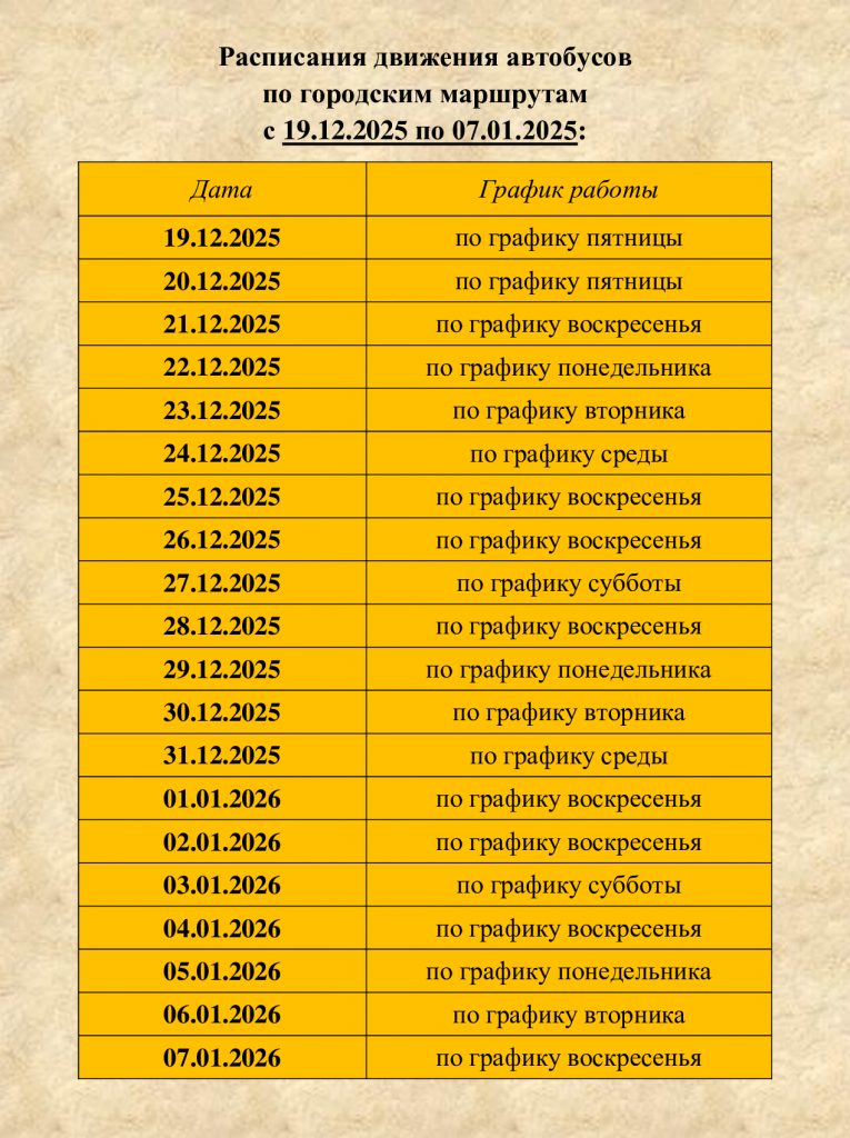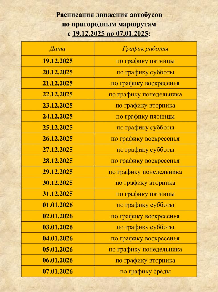 Расписание движения автобусов в период с 19.12.2025 по 07.01.2026