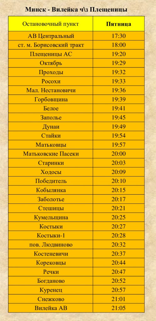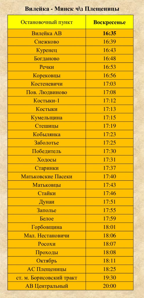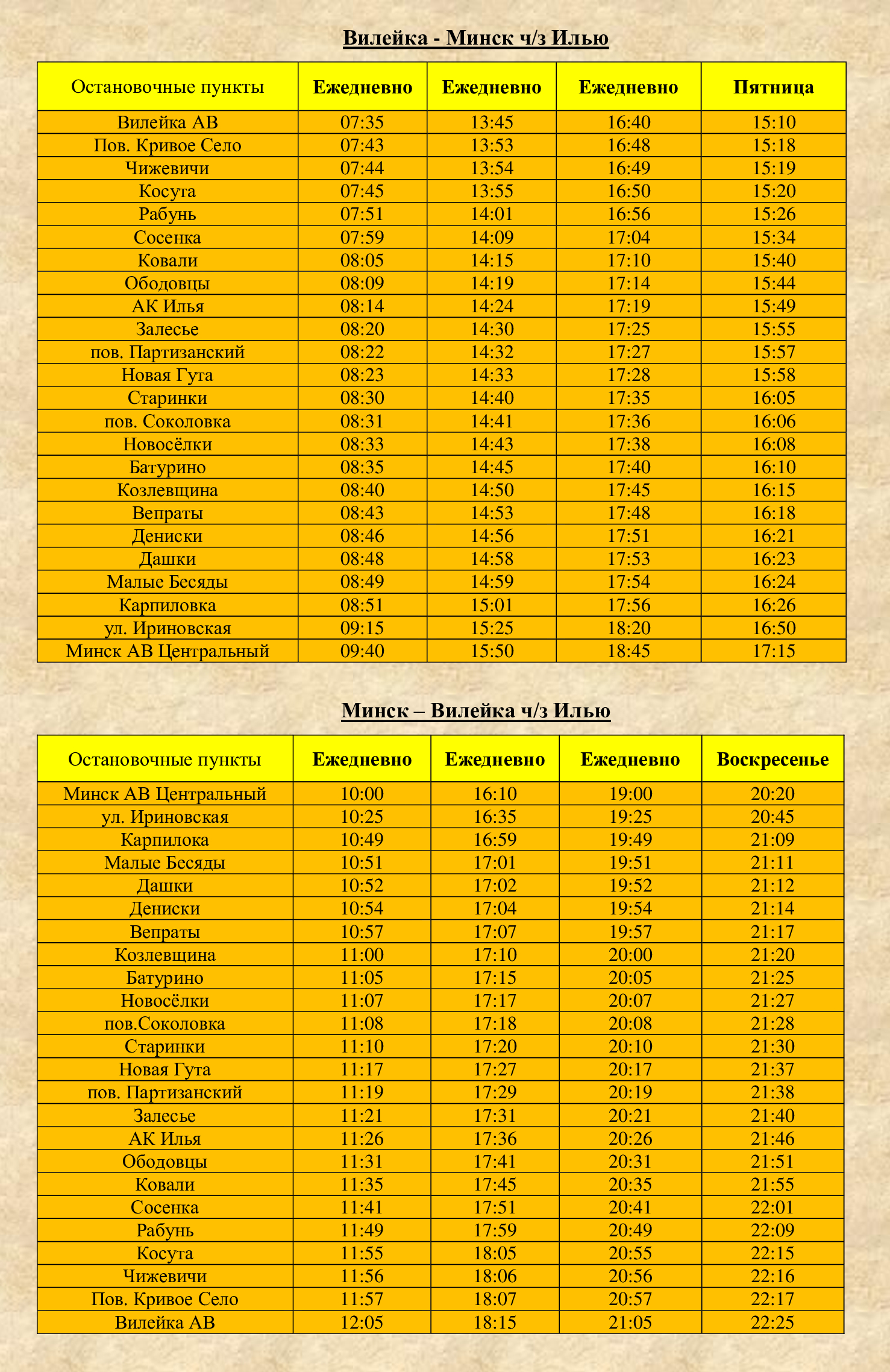 Расписание Городские маршруты № 1 «Маковье - Веры Хоружей» № 2 «Ставки - Карвели» № 3 «Оранжерея - Волынца» № 3а «Оранжерея - Волынца» № 3и "Волынца - Оранжерея - Куренец" № 4 «Оранжерея - Водохранилище» № 5 «Маковье - Волынца» Схема движения автобусов в городе Вилейка Пригородные маршруты Вилейка - Бубны Вилейка - Вороничи Вилейка - Добровичи Вилейка - Долгиново Вилейка - Заболотье Вилейка - Илья - Хотенчицы Вилейка - Ковали - Нарочь Вилейка - Кордон Вилейка - Кузьмичи (Будки, Талуть) Вилейка - Лыцевичи - Боровые Вилейка - Молодечно Вилейка - Молодечно ч/з Шиловичи Вилейка - Осиновка - Красница Вилейка - Осиповичи Вилейка - Рацевичи Вилейка - Русское село Вилейка - Селище Схема движения автобусов по Вилейскому району Междугородние маршруты Вилейка - Минск ч/з Ждановичи Вилейка - Минск ч/з Илью Вилейка - Минск ч/з Плещеницы Вилейка - Боровляны