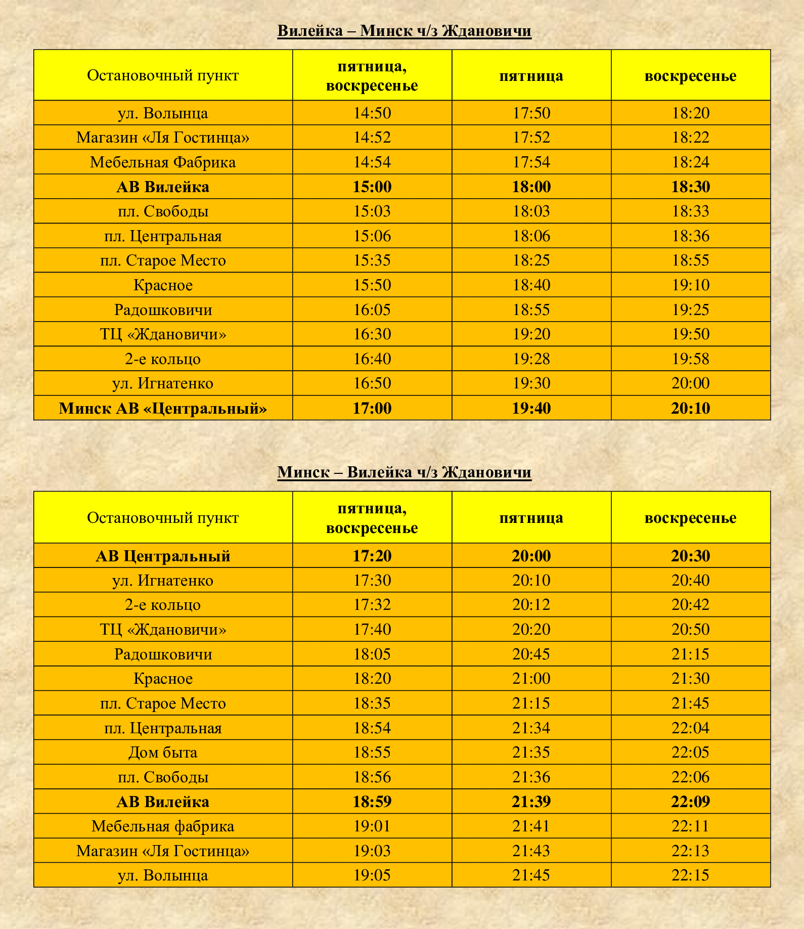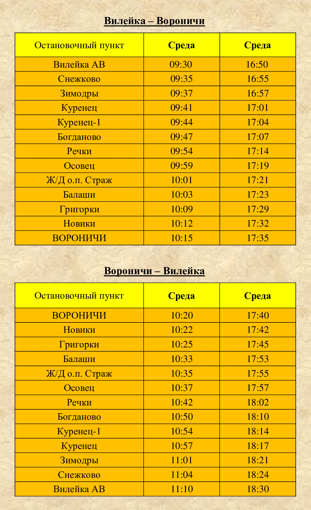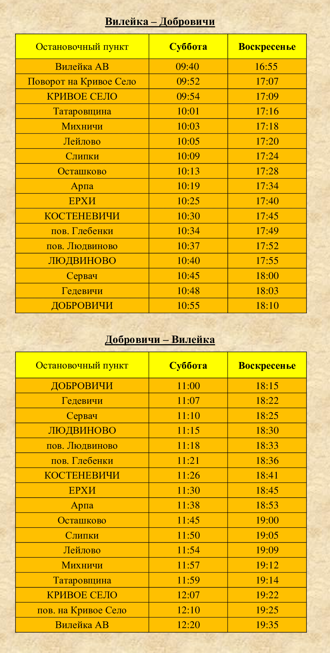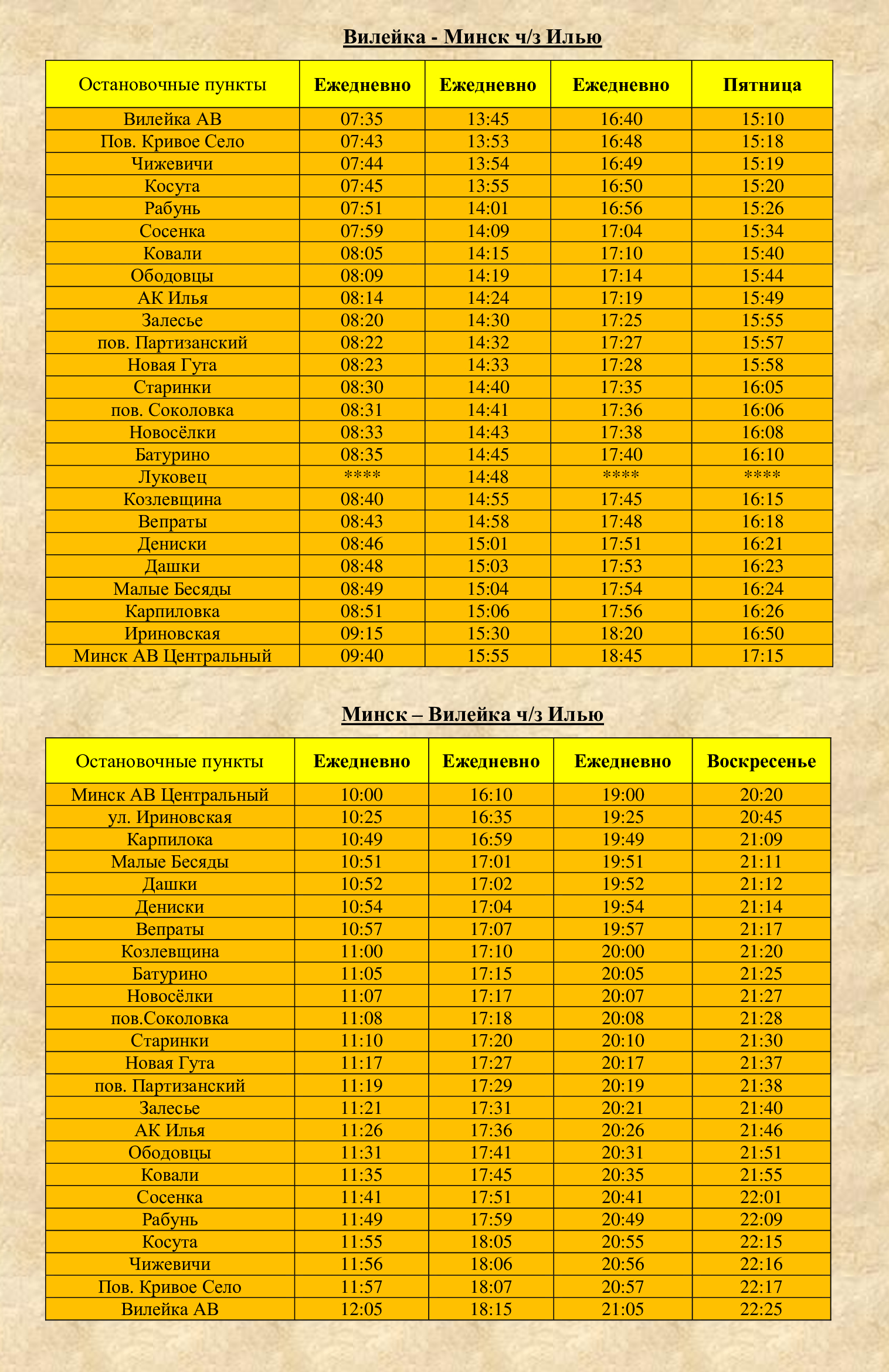 Расписание Городские маршруты № 1 «Маковье - Веры Хоружей» № 2 «Ставки - Карвели» № 3 «Оранжерея - Волынца» № 3а «Оранжерея - Волынца» № 3и "Волынца - Оранжерея - Куренец" № 4 «Оранжерея - Водохранилище» № 5 «Маковье - Волынца» Схема движения автобусов в городе Вилейка Пригородные маршруты Вилейка - Бубны Вилейка - Вороничи Вилейка - Добровичи Вилейка - Долгиново Вилейка - Заболотье Вилейка - Илья - Хотенчицы Вилейка - Ковали - Нарочь Вилейка - Кордон Вилейка - Кузьмичи (Будки, Талуть) Вилейка - Лыцевичи - Боровые Вилейка - Молодечно Вилейка - Молодечно ч/з Шиловичи Вилейка - Осиновка - Красница Вилейка - Осиповичи Вилейка - Рацевичи Вилейка - Русское село Вилейка - Селище Схема движения автобусов по Вилейскому району Междугородние маршруты Вилейка - Минск ч/з Ждановичи Вилейка - Минск ч/з Илью Вилейка - Минск ч/з Плещеницы Вилейка - Областная больница (Боровляны)